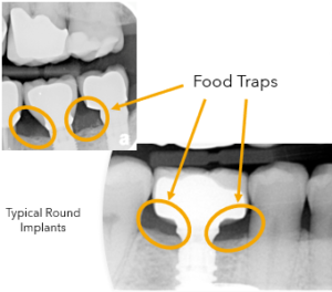 Traditional round dental implants can sometimes lead to the frustrating issue of food trapping.This occurs because round implants’ limited footprint commonly restricts the ability to create a naturally-shaped restoration, resulting in gaps and food traps. Fortunately, modern advancements in implant design aim to alleviate this problem by introducing more anatomically shaped implants.